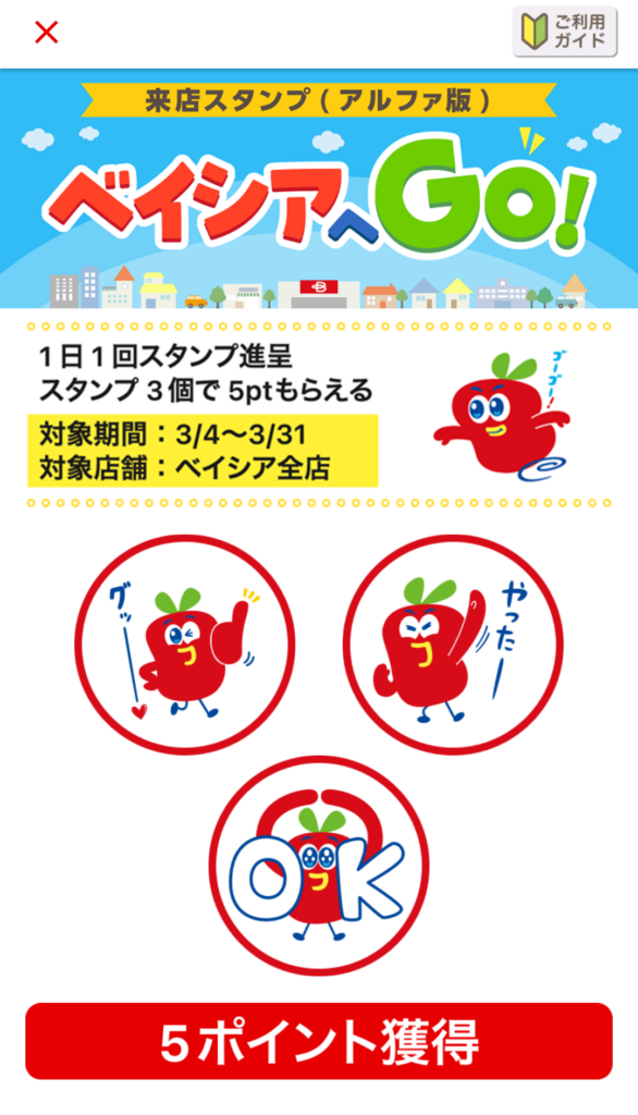 獲得できるスタンプは1日1個までです。スタンプを全て集めるとベイシアポイント5Pt獲得できます。