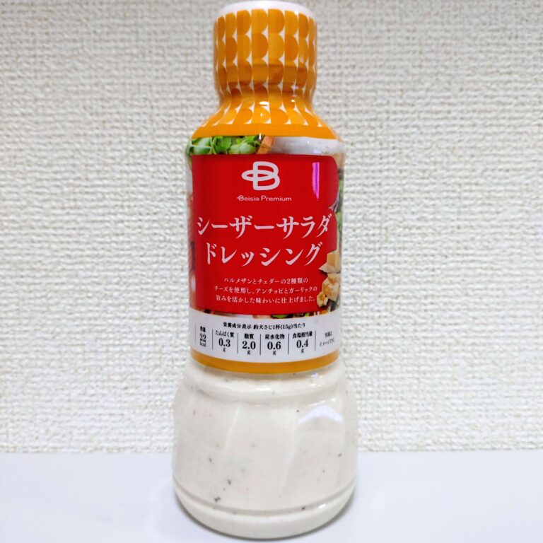 その中でもやはり、ベイシアプレミアムのシーザーサラダドレッシングの高コスパを実感できるのでおススメです。