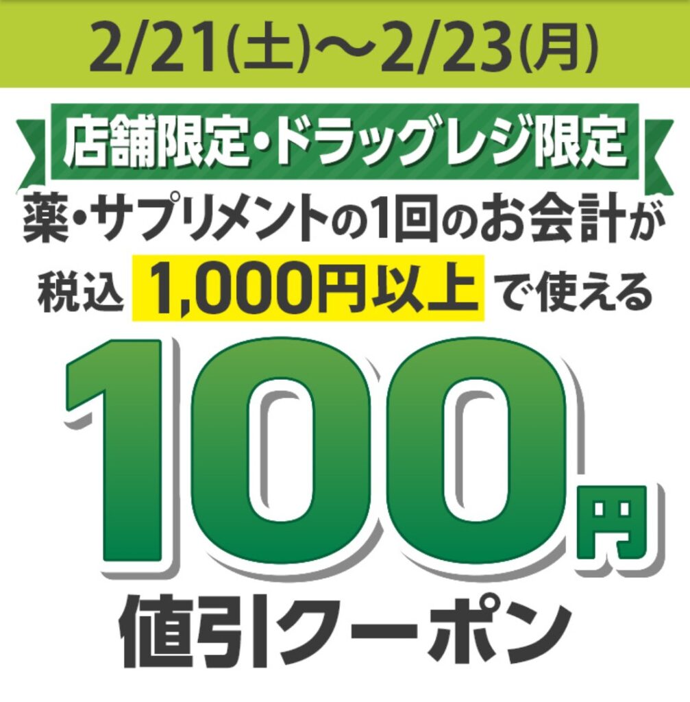 - 店舗限定・ドラッグレジ限定100円引きクーポン 2/21~2/23
