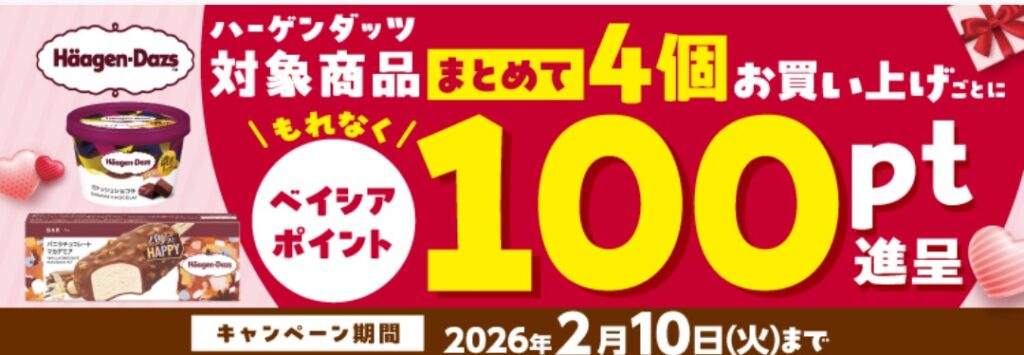 ハーゲンダッツ対象商品をまとめて4個購入ごとにもれなくベイシアポイント100Pt獲得