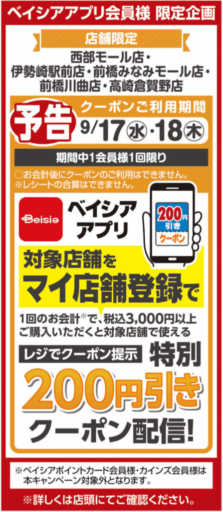 さらに群馬県店舗限定ですが、9/17(水)・18(木)の期間中、西部モール店・伊勢崎駅前店・前橋みなみモール店・前橋川曲店・高崎倉賀野店の5店舗で、1会員1回限りで1日の会計金額が税込3,000円以上で200円引きクーポンが利用できます。