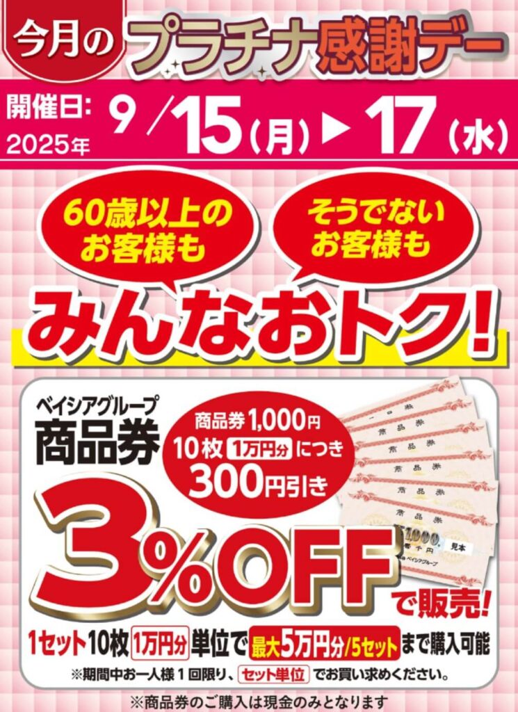 まずは全店対象で9/15(月)・16(火)・17(水)の3日間限定でベイシアグループ商品券が3%OFFで販売されます。