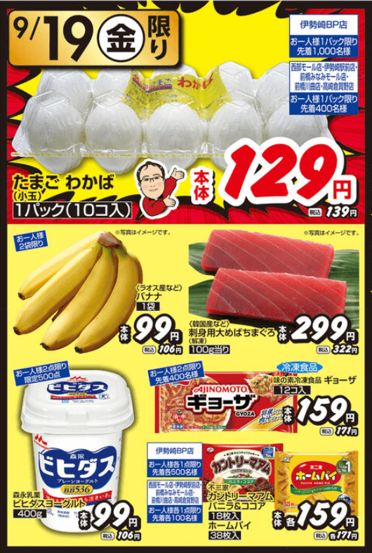 一番お買い得なのは、リニューアルオープンの伊勢崎BP店ですよね。協賛店舗にはない商品掲載がありますので、行ってみたい気もしますが、店舗までの距離と時間を考えると、いつも通りの店舗で買い物してしまうと思います。