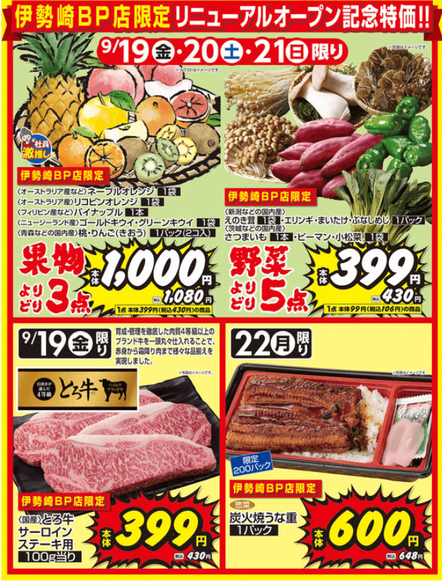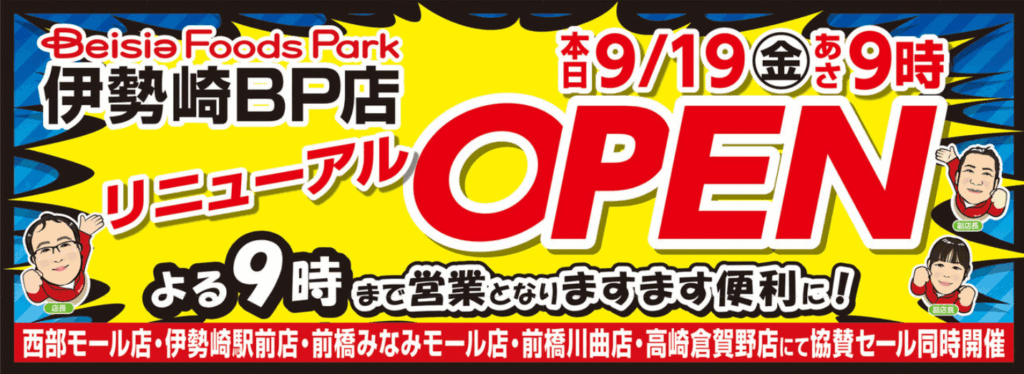 本日9月19日(金) ベイシアアプリでマイ店舗チラシを見ると、伊勢崎BP店のリニューアルオープンによって、協賛セールが開催されることが分かりました。
