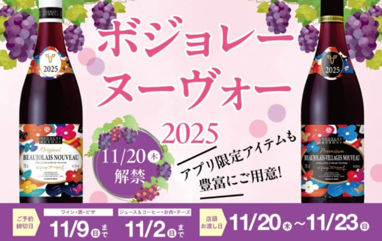 2025年のボジョレーヌーヴォーの予約が始まりました。ベイシアアプリのご予約機能を活用することで、ベイシアポイントを獲得して購入することができたり、アプリ限定のワインセットも予約することができます。