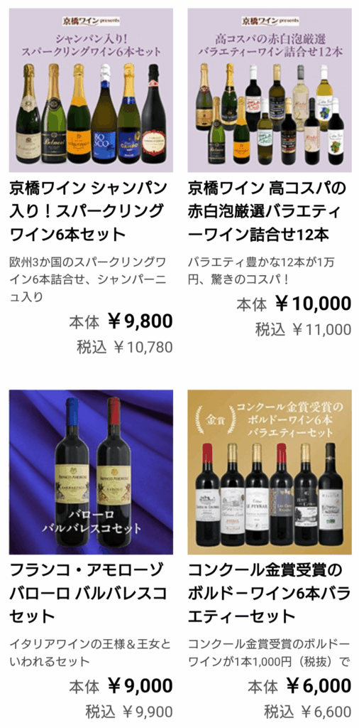 下記は一例ですが、ボジョレーヌーヴォー各種7種類、国産新酒6種類、ジュース&コーヒー6種類、ワインのおとも4種類、アプリ限定のワインセットが4種類のラインナップです。