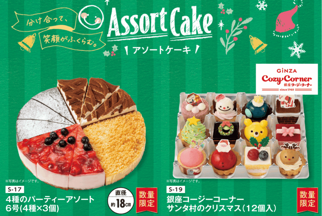 バラエティケーキは10種類あります。タルト系やブッシュ・ド・ノエル系、山崎製パンや銀座コージーコーナーのケーキなど様々です。一部商品は数量限定で予約終了してしまう恐れがありますので、早めに予約したいですね。