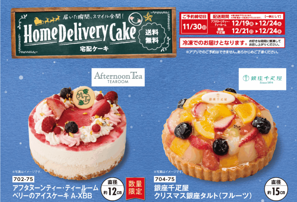 宅配ケーキ12種類あり、冷凍でのお届けとなります。店頭のほか、ベイシア楽天市場店、ベイシアヤフーショップなどのオンラインショップで予約が可能です。ベイシアアプリでは予約できません。