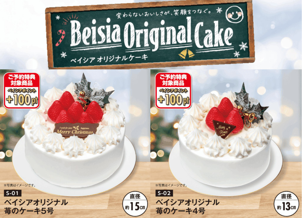4号は直径約13cmの苺別添え3個で、予約特典でベイシアポイント100ポイント、さらに11/30までの予約は100円引きで税込3,661円です。