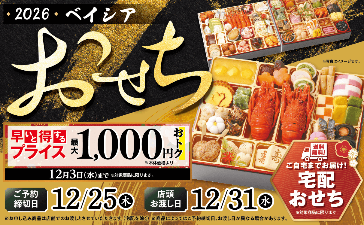 2026年のおせちメニューの予約が始まりました。ベイシアアプリからの予約がお得になるのでおススメです。
