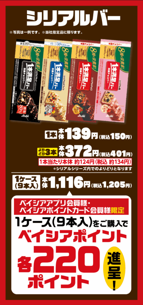 • ベイシア越生店、ベイシア薬品坂城店、ベイシアマート各店舗で対象商品を販売している場合、ポイント付与の対象となります。