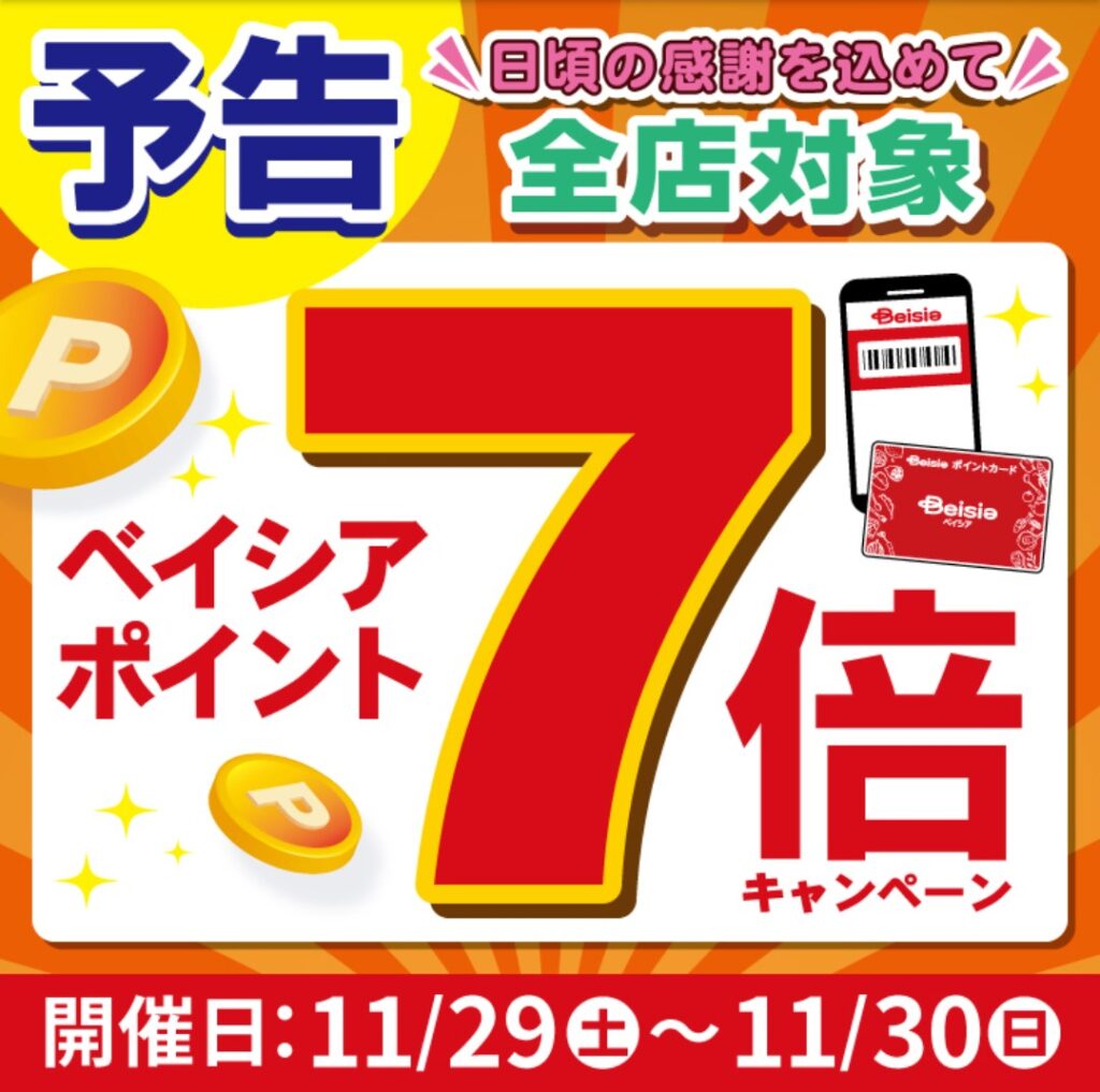 11/29(土)・30(日)の期間限定で全店対象、ベイシアポイント7倍キャンペーンが開催されます。