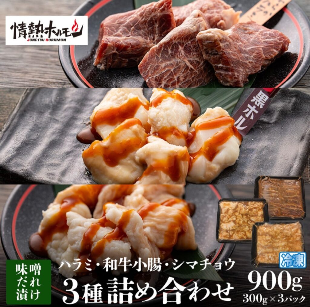 情熱ホルモン やわらかハラミ・和牛小腸・シマチョウ 3種の味噌だれ詰合せ 計900g(各300g) 税込3,980円