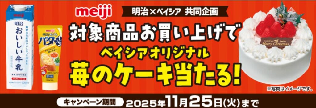 明治の商品を税込500円分以上のレシートでベイシアオリジナル 苺のケーキ5号を抽選で140名にプレゼント
