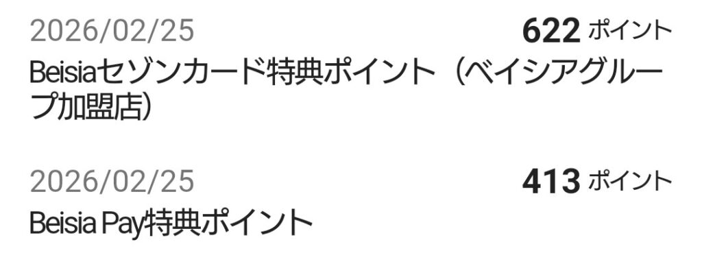 | 2/25 | 622Pt 413Pt | Beisiaセゾンカード特典 BeisiaPay特典 | |||