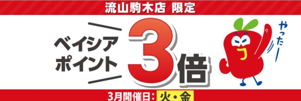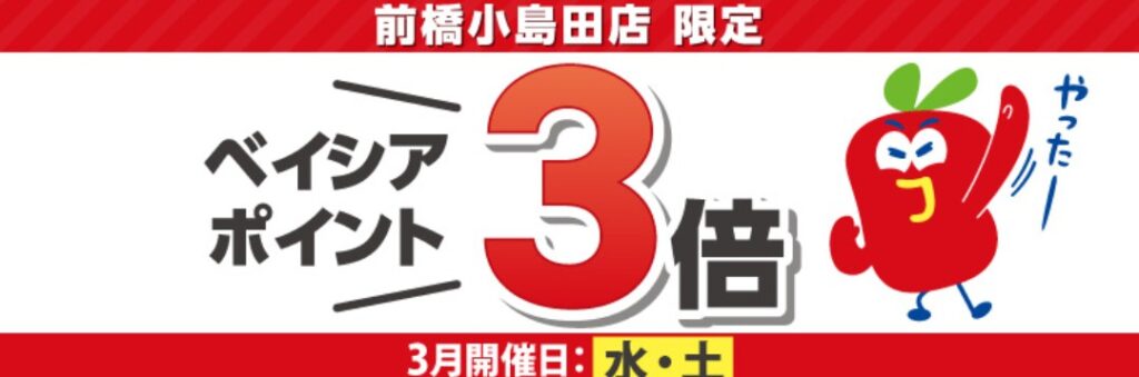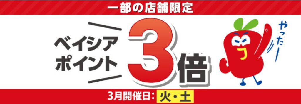 1月から15店舗増えました、毎週火曜土曜のベイシアポイント3倍キャンペーンが継続されます。