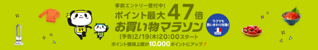 - 事前エントリー可 2月の楽天お買い物マラソン 2/19(木)20:00~2/23(月)1:59