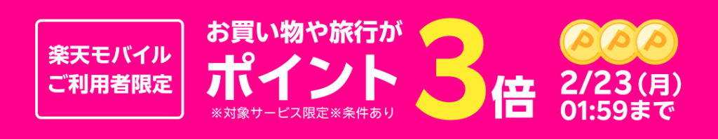 - 楽天モバイル利用者限定 ポイント3倍 2/23 01:59まで