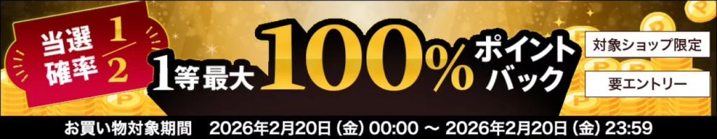 2/20(金))は対象ショップ限定で、1等最大100%ポイントバックのお得なキャンペーンが開催されます。